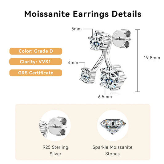 2024 New D1.80CT Moissanite Stud Earrings Three Stones Ear Jacket for Women 925 Sterling Silver Earring Dual Use Jewelry Gift