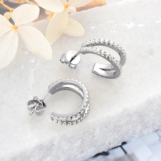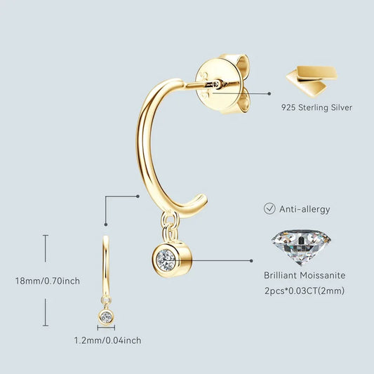 Bezel 2mm Moissanite Drop Studs Earrings 925 Silver C-shaped Earrings Cuff for Women Girl Simple Daily Ear Jewelry Gifts