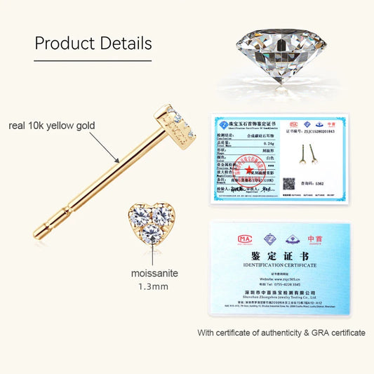 Solid 10K Yellow Gold Moissanite Earrings for Women Super Mini Heart Studs Earrings Piercing Ear Wedding Engagement Jewelry Gift