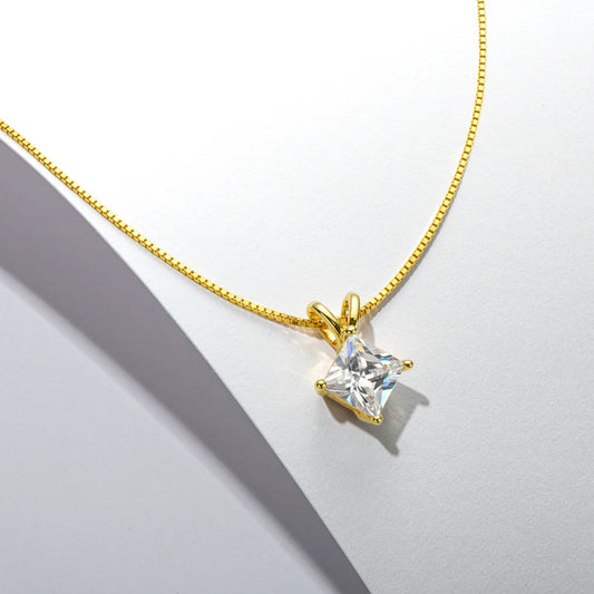 Square moissanite stones in simple prong or bezel settings for minimalist elegance.
