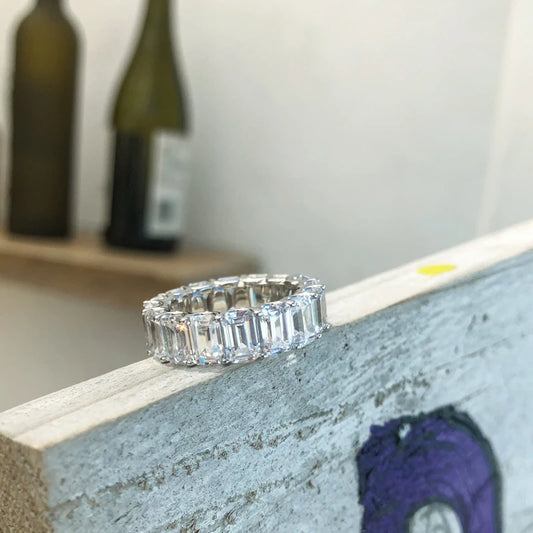 925 Sterling Silver Emerald Cut Eternity Engagement Ring Simulated Diamond Wedding Silver Full Eternity Ring Jewelry